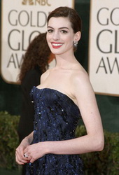 С Анной Хэтэвей работала Кейт Ли. «Анна была похожа на точеную статуэтку. В темно-синем платье с черным слоем ткани по верху был особенно заметен ее алебастровый оттенок кожи. Я же всегда стараюсь сделать образ классическим, когда нужно накрасить актрису для торжественной церемонии», - рассказывает К.Ли. Визажист решила нанести на веки тени телесного цвета и вообще всячески их затушевать. У линии роста ресниц она наложила темноватые тени, чтобы сгладить контраст от туши. На ресницы визажист нанесла несколько слоев туши, а брови подвела карандашом. После этого она наложила немного румян телесного оттенка на верхние скулы. А вот губы Кейт Ли подчеркнула помадой оттенка спелой малины.