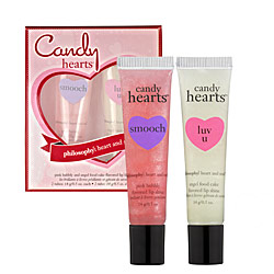 Бренд Philosophy выпустил новый симпатичный набор Candy Hearts Lip Duo, который включает в себя два изумительных блеска для губ со вкусом пирожного Luv U Angel Food Cake Flavored Lip Shine и жвачки Smooch Pinkly Bubbly Flavored Lip Shine.