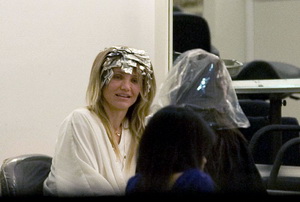 В салоне Кэмерон Диаз провела около трех часов. Пока стилист работал, она болтала по телефону. В соседнем кресле сидела еще одна звезда — певица Ферджи