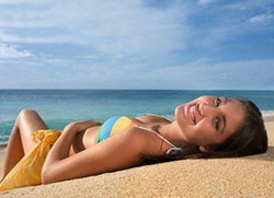 Во-первых, какой бы хорошей ни была тональная основа, для пляжа она слишком тяжелая. Поэтому для приема солнечных ванн подготовьте бронзирующий увлажняющий крем с SPF не менее 15. Хотя желательно дополнить защиту еще и специальным солнцезащитным кремом. Завершить работу с цветом кожи можно небольшим количеством бронзирующей пудры.