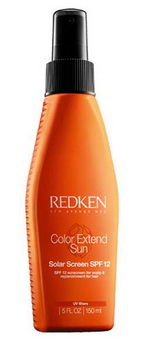 Популярный бренд Redken представляет новый спрей против солнца. Он будет защищать не кожу лица и тела, как большинство подобных средств, а волосы и кожу головы. Средство называется Redken Color Extend Sun Solar Screen SPF 12. Оно ложится на волосы ровной плёночкой, при этом не утяжеляя шевелюру, и защищает локоны от вредных ультрафиолетовых лучей типа А и В.