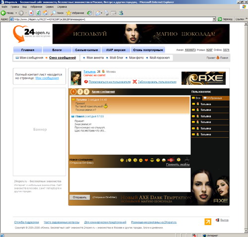 К примеру, в разделе 24open.ru, где представлены фотографии мужчин, желающих найти себе подругу, каждое изображение сопровождал рисунок нового AXE и заголовок "Самые-самые парни". В случае, если фотография увеличивалась заинтересованной стороной, ее сопровождало изображение взволнованной девушки с испачканными шоколадом губами. Кроме того, наверху сайта был размещен баннер, призывающий посетителей сайта знакомств использовать магию шоколада, чтобы найти себе партнера.