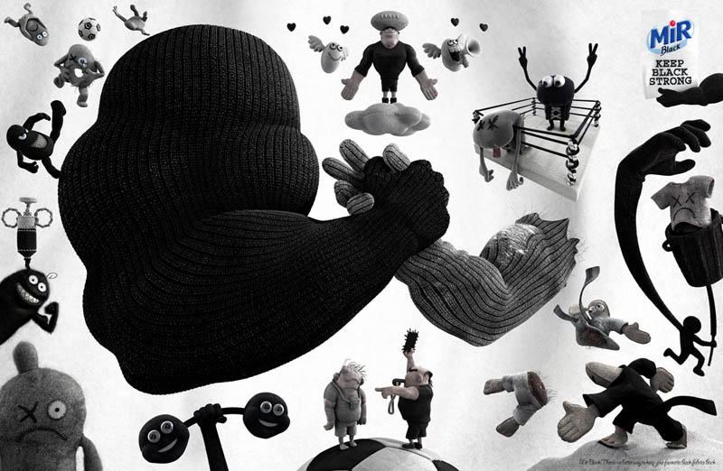 Армрестлинг с расистским подтекстом, огромные пауки и всеобщий любимец Дарт Вейдер должны, согласно задумке TBWA Paris, поведать нам о том, что настоящий черный цвет — это не просто нечто усреднённо-мрачненькое. Нет, чёрный должен быть угольным, неистовым, сокрушающим, лишающим всякой надежды и беспросветным. А об этом, как скромно сообщается в правом верхнем углу каждого из трёх принтов кампании, позаботится французское средство Mir Black.