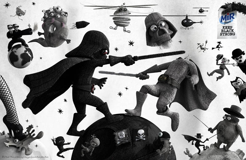 Вообще, конечно, такое можно было бы придумать о любом цвете, подобрав соответствующие масскультурные фигуры и знакомые всем с детства феномены. К примеру, флагманом кампании Mir Green мог бы стать источающий изумрудное сияние огр Шрек. А Mir Red, в каком-нибудь российском изводе, — ослепительно алый Синьор Помидор. Но чёрное на белом смотрится, согласитесь, очень красиво.
