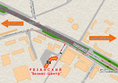 От остановки в обратном направлении в сторону центра мимо эстакады до поворота налево к проходной РЯЗАНСКОГО БИЗНЕС ЦЕНТРА.