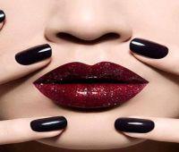 15. Создайте образ женщины-вамп с глянцевой кроваво-красной помадой и черным лаком на ногтях.