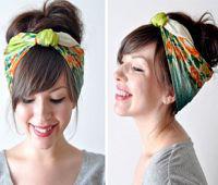 Из платка можно свернуть повязку: возьмите ткань за противоположные концы и скрутите внутрь. Если хотите более узкую повязку, сложите еще раз вдвое. Свободные края зафиксируйте узлом на затылочной области. Можно создать ещё более замысловатый бандаж: для этого сложите платок в виде неширокой полосы, накиньте на шею и выровняйте длину краёв и пропустите их через небольшое кольцо. Натяните переднюю часть повязки на голову и затяните чуть выше лба. Свободные части платка заведите за затылок и укрепите тугим узлом.