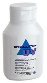 SPEZIALLOTION UV - это защитная эмульсия от повреждающего действия ультрафиолетового излучения. Он обладает эффективной защитой от широкого спектра лучей - от ультрафиолетовых лучей спектра А, спектра В и спектра С. Поэтому он подходит для защиты как от искусственного, так и естественного ультрафиолетового излучения.