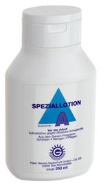 После очистки соответствующих участков кожи их намазывают эмульсией SPEZIALLOTION A до начала работы и после перерывов. Обязательно нанесите эмульсию на особо подверженные вредному воздействию участки кожи, в частности, между пальцами и вдоль ногтей. При продолжительной работе наносите эмульсию повторно. Следите за тем, чтобы эмульсия не попала в глаза.