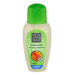 Содержит экстракт календулы, который оказывает антисептическое действие и благотворно влияет на процесс регенерации кожи. Лосьон прекрасно освежает, очищает и тонизирует кожу. Применение: небольшое количество лосьона нанесите на ватный тампон и очистите им кожу. При ежедневном использовании лосьона-тоника ваша кожа приобретает тонус и сияет здоровьем.