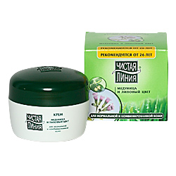 Крем «Чистая линия» с экстрактами медуницы и липового цвета содержит уникальный комплекс натуральных компонентов, направленных на сохранение молодости нормальной и комбинированной кожи в возрасте от 26 лет: