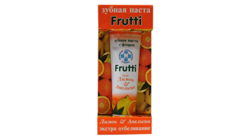 "Frutti Лимон&Апельсин" - гелевая зубная паста для зубов и десен, обладает противовоспалительным, ранозаживляющим и отбеливающим эффектом. Благодаря содержанию активного фтора усиливает профилактику кариеса, а аромат лимона и апельсина надолго придает свежесть дыханию.