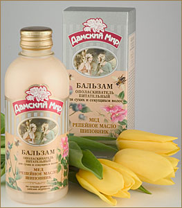 Бальзам, в состав которого входят мед, репейное масло и экстракт шиповника, усиливает оздоровительный эффект шампуня, облегчает расчесывание и укладку волос.
