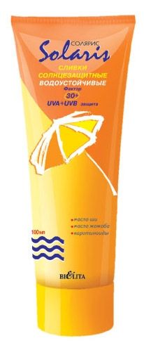 Новейшее средство для совмещения безопасного загара с купанием. Водоустойчивая формула обеспечивает сохранение солнцезащитных свойств при контакте с водой. Не требует повторного нанесения после купания. Сливки обеспечивают защиту от ультрафиолетовых лучей как в А- так и в В-диапозоне. Натуральные масла ши, жожоба и каротиноиды увлажняют кожу и защищают ее от иссушающего повреждающего воздействия солнца. Сливки легко наносятся и быстро впитываются.