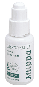 Вода дистиллированная, кислоты: гликолевая, лимонная, молочная; модифицированная целлюлоза, хитозан, натрия гидроксид. Суммарное содержание кислот 25 %, рН = 2,4 – 2,8.