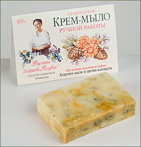 Мыльный корень – это натуральная, хорошо пенящаяся основа, которая намного мягче, чем щелочная, используемая обычно. Масло кедровых орешков питает кожу, способствуя более активному процессу обновления клеток и омолаживанию кожи, а календула очищает ее.