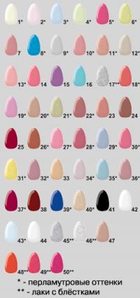 Лак не содержит формальдегида, камфары, толуола. Изысканность, женственность и элегантность с новыми двухкомпонентными формулами. Блестящий лак ровно ложится и долго держится на ногтях. В коллекции представлены как классические, так и ультрамодные цвета с включением перламутра, блесток и жидких кристаллов. 50 тонов!