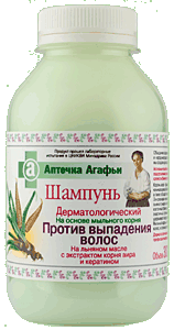 брэнд: Рецепты бабушки Агафьи серия: Аптечка Агафьи рубрики: Средства против выпадения волос -Средства для ухода за волосами. -Косметика и парфюмерия Aктивные компоненты, входящие в состав шампуня, обеспечивают оздоровление луковицы волоса, стимулируют ее усиленное кровоснабжение, повышают тонус кожи. Корень аира – традиционное средство, применяемое при начинающемся облысении. Содержит большое количество витамина С, а также обладает выраженным антимикробным действием. Линоленовая ненасыщенная жирная кислота, входящая в состав льняного масла – природный эликсир молодости. Она улучшает клеточный обмен, укрепляет барьерную функцию кожи. Кератин – эластичный, прочный белок, входящий в состав волос и ногтей, удерживает влагу, препятствует обезвоживанию кожи головы и волос
