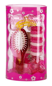 В наборе 64 предмета: расческа, щетка, разноцветные зажимы для волос, резиночки, в том числе и для африканских косичек, зеркальце-брелок, то есть всё для создания самой стильной причёски.