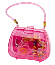 В симпатичной пластиковой сумочке «спрятаны» блеск для губ, бусы, браслет, два колечка и наклейки для тела.