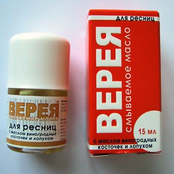 Верея - масло смываемое для ресниц c маслом виноградных косточек и лопухом благотворно влияет на ресницы и кожу век. Масло виноградных косточек содержит полиненасыщенные кислоты, которые способствуют увлажнению и сбалансированному питанию кожи век, предохраняя их от преждевременного старения.