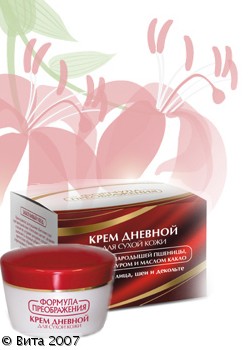 Дневной крем для сухой кожи с маслом зародышей пшеницы стимулирует обменные процессы в клетках кожи и оказывает регенерирующее действие. Крем предупреждает воспаление, смягчает, питает и увлажняет кожу, восстанавливая ее гидролипидный и кислотный баланс. Быстро устраняет шелушение, придает коже эластичность, разглаживает мелкие морщины и препятствует образованию новых морщин.