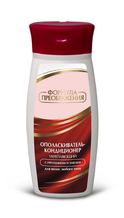 Ополаскиватель-кондиционер с протеином и хмелем восстанавливает структуру, повышает прочность волос, увлажняет и разглаживает поверхность волос по всей длине. Облегчает расчёсывание, придаёт причёске пышность и объём, возвращает волосам естественную красоту и блеск. Натуральный негидролизованный белок из зерен пшеницы, экстракт шишек хмеля усиливают водный и жировой обмен в клетках кожи, предупреждают воспаления на коже головы.